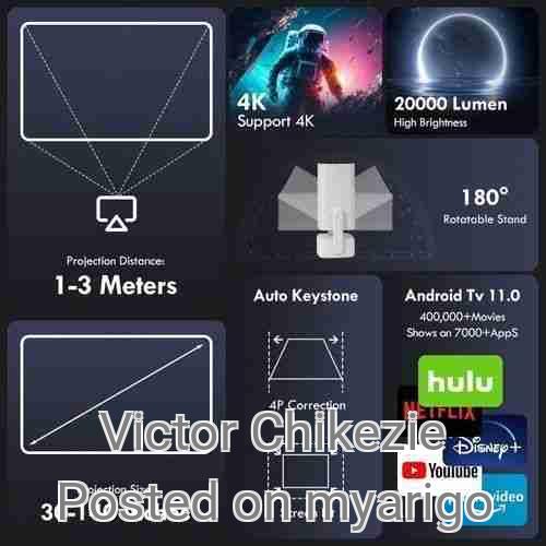 Display: 2.69" LCD Light Source: LED Color Temperature: 8000-10000K Light Source Life: 30,000H Light Brightness: 130ANSI Light Type: LED Lens: 3-piece glass lens Standard Resolution: 1280*720/60Hz Supported Resolution: 4K/60Hz Contrast Ratio: 800:1 Projection Area: 40-130 inches Image Scale: 4:3/16:9 Optimal Size: 40-80 inches Contrast: 1.5:1 Luminance Uniformity: 65% Projection Distance: 1-2.5m Intentional Keystone Correction Speaker Built-in 4Ω2W speaker*1 Connector Details HDMI Port: Standard HDMI 2.0*1 USB Port: Standard USB 2.0*1 Audio Out Port: Standard φ3.5 audio port*1 Power J ack: AC90-260V/50-60MHZ power port Power Button: On/Off button Standard Accessories Power Cable: 1.2M Standard Power Cable*1 AV Cable: 24cm Standard AV Cable*1 Specifications*1 Remote Control: Standard Remote Control*1 Software Details Operating System: ARM Cortex-A53 Operating System: Android 11 GPU: ARM G52 2EE Bluetooth: AW869A - Dual-Band WiFi 6 Module + BT 5.0 RAM 1G 8G ROM 4K 60fps H.265/H.264/VP9 • eDP/HDMI2.0/MIPI/LVDS/EBC Supports iPhone, Android screen mirroring, wireless mirroring Audio support MP3/WMA/ACC Photo support JPG, BMP, PNG, image scaling Video support Full-format decoding, including HEVC/VP9/AVS2/AVC and MPEG1/MPEG2 1080p/60fps, etc. Text support TXT Multiple language support
